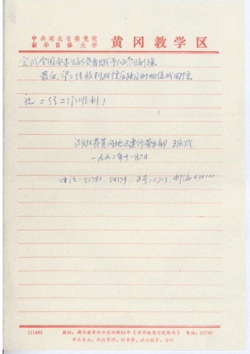 Here, on behalf of my parents: Wang Jiale, Cui Fuying, elder brother: Wang Yousheng, elder sister: Wang Hanxiang, younger brother: Wang Yingqing, younger sister: Wang Qingfang, and myself, through the information communication channel of you two, regarding physical ravage and mental trauma, as well as fundamental property loss brought by the invasion of the Japanese Army to our family, we demand Japan to compensate 50000 yuan. Meanwhile, our whole family want to express admiration and appreciation for you two and others who have worked tirelessly for the campaign to seek damage compensation from Japan, our whole family is willing to join hands with tens of thousands of victims and their family members of the Japanese invasion, work together to accomplish the success of acquiring damage compensation from Japan.