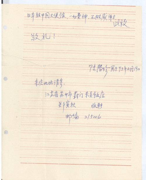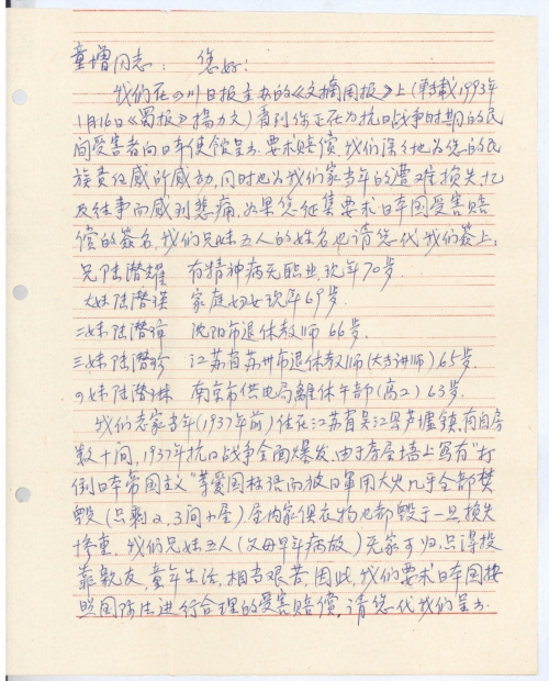 我们在四川日报主办的《文摘周报》上(转载1993年1月16日《蜀报》杨力文)看到你正在为抗日战争时期的民间受害者向日本使馆呈书,要求赔偿,我们深深地为您的民族责任感所感动,同时也为我们家当年的遭难损失,忆及往事而感到悲痛,如果您征集要求日本国受害赔偿的签名,我们兄妹五人的姓名也请您代我们签上: