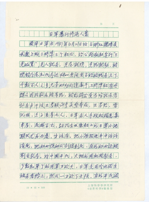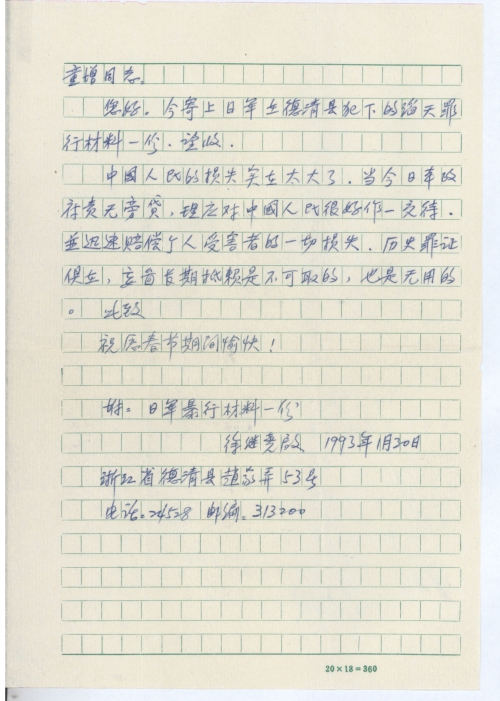 Other details:Mailed a material for revealing the Japanese Army’s atrocities, and give detailed explanations on facts of Japanese invaders’ intrusion into Deqing County.
