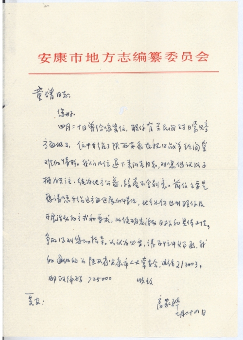 四月二十日曾给您寄信,联系有关民间对日索赔方面的事,信中介绍了陕西安康在抗日战争期间受难的情形。我们几位退下来的老同志,对您倡议此事极为关注,纯为地方公益,丝毫不含别意。前信主要是想请您介绍这方面进展的情况,地方如何进行联系及开展活动的方式和要求,以便确定活动目标和具体办法,争取得到您的指导。如认为必要,请百忙中赐函,我的通讯处为陕西省安康市人大常委会,电话213003,邮政编码725000。