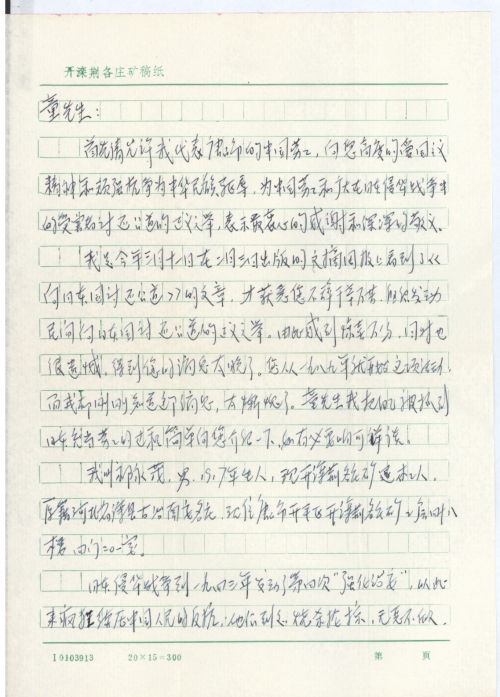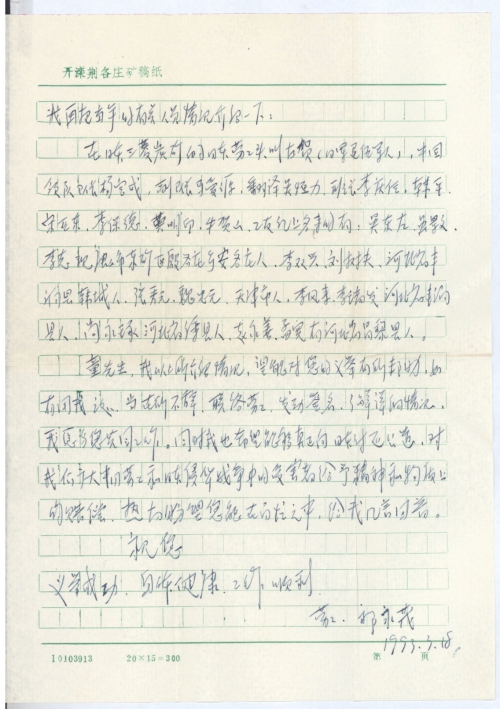 童先生,我以上所介绍情况,望能对您的义举有所帮助,如有用我之处,当在所不辞,联络劳工、发动签名、了解详细情况,我愿与您共同工作。同时我也希望能够真正向日本讨还公道,对我们广大中国劳工和日本侵华战争中的受害者给予精神和物质上的赔偿,热切盼望您能在白忙之中,给我几言回音。