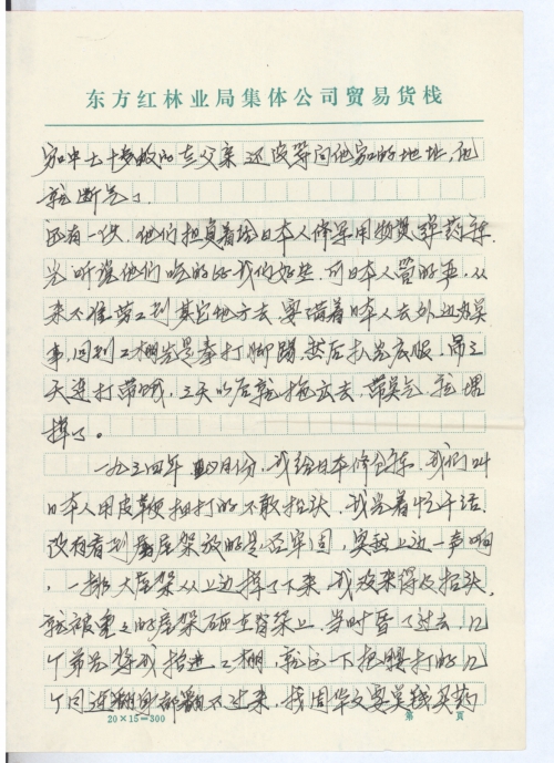 一九三四年2月份,我给日本修仓库,我们叫日本人用皮鞭抽打的不敢抬头,我光着忙干活,没有看到屋架放的是否牢固,突然上边一声响,一排大屋架从上边掉了下来,我没来得及抬头,就被重重的屋架砸在脊梁上,当时昏了过去,几个弟兄将我抬进工棚,就这一下把腰打的几个月连翻身都翻不过来,找周华文要点钱买药治疗,周根本不理睬,后来使大伙凑了几个钱弄来点中药,算把命保住了,一直到现在不能干体重活,造成终身残疾。后来就回到老家去了。