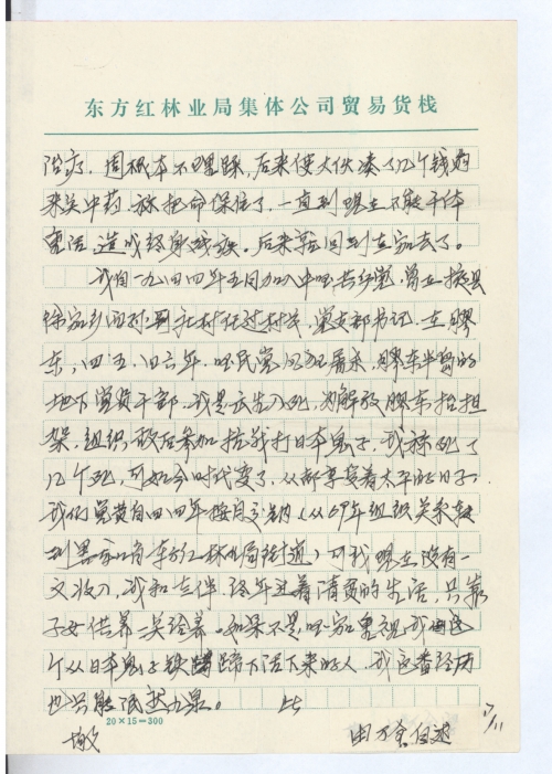 我自一九四四年五月加入中国共产党,曾在掖县徐家乡西孙哥庄村任过村长,党支部书记,在膠东,四五、四六年,国民党疯狂屠杀,膠东半岛的地下党员干部,我是出生入死,为解放膠东抬担架,组织敌后参加抗战打日本鬼子,我算死了几个死,可如今时代变了,人人都享受着太平的日子,我们党费自四四年按自交纳。(从69年组织关系转到黑龙江省,东方红林业局街道)可我现在没有一文收入,我和老伴,终年过着清贫的生活,只靠子女供养一点给养。如果不是国家重视我这个从日本鬼子铁蹄下活下来的人,我这番经历也只能泯然九泉。