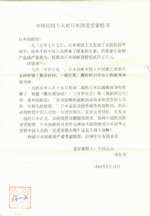 中国民间个人对日本国受害索赔书