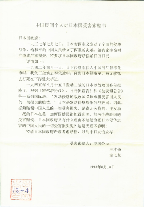 中国民间个人对日本国受害索赔书
