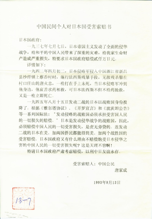 细节:1942年日军杀害无辜百姓唐火忠,根据国际法要求日本赔偿。备注:信封丢失