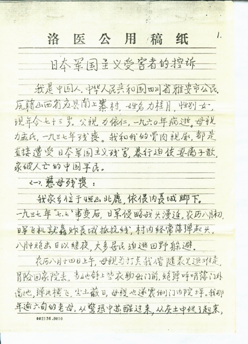 我是中国人,中华人民共和国四川省雅安市公民,原籍山西省应县南上寨村,姓名力桂月,性别女,现年龄七十三岁。父亲力衣仁,一九六0年病逝。母亲力孟氏,一九三七年残丧。我和我的骨肉亲属,都是直接遭受日本军国主义残害,暴行迫使妻离子散、家破人亡的中国平民。