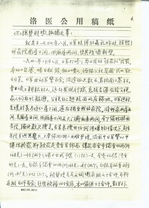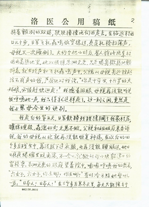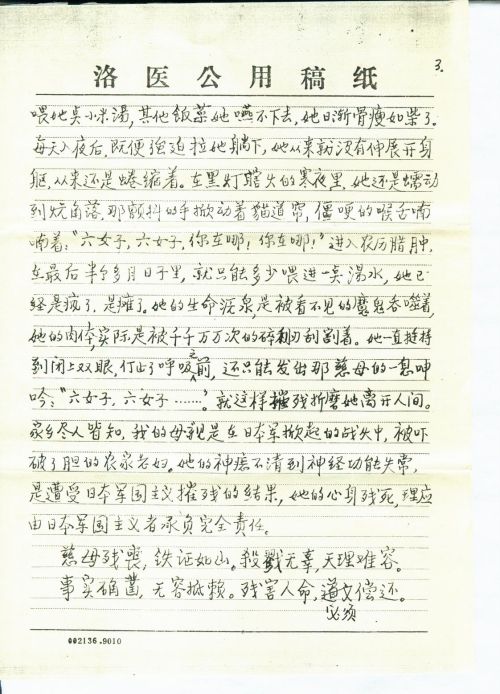 我走后的第五天,日军铁蹄残踏蹂躏了我家村庄,掳掠烧杀,奸淫妇女,无恶不做。父亲和姐姐后来告诉我,我的母亲从此就再没能恢复神[智],在以后的四个多月残生中,再没脱下过衣服,也再没能睡眠过。她日日夜夜蜷缩在炕角落,不一会儿就掀动那小块猫道口的窗格帘,呆滞无光的眼窥望着院中。喃喃呼唤我的乳名,“六女子,六女子,你在哪!你在哪!”有时冷不防她惊吼一声:“日本人!日本人!”在三个多月寒冬天里,每天只能强行喂她点小米汤,其他饭菜她[咽]不下去,她日渐骨瘦如柴了。每天入夜后,[即]便强迫拉她躺下,她从来就没有伸展开身躯,从来还是蜷缩着。在黑灯瞎火的寒夜里,她还是蠕动到炕角落,那颤抖的手掀动着猫道帘,僵[硬]的喉舌喃喃着:“六女子,六女子,你在哪!你在哪!”进入农历腊月中,在最后半个多月日子里,就只能多少喂进一点汤水,她已经是疯了,是瘫了。她的生命源泉,是被看不见的魔鬼吞噬着,她的肉体,实际是被千千万万次的碎利刃刮割着。她一直[坚]持到闭上双眼,停止了呼吸之前,还只能发出那慈母的一息呻吟:“六女子,六女子……”。就这样摧残折磨她离开人间。家乡尽人皆知,我的母亲是在日本军掀起的战火中,被吓破了胆的农家老妇,她的神[志]不清到神经功能失常,是遭受日本军国主义摧残的结果,她的心身残死,理应由日本军国主义者承负完全责任。