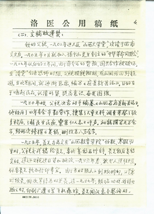 一九三〇年始,父亲决意动手编纂《山西省应县新县[志]》。他经历了四年有余辛勤劳作,搜集了大量史料,调查考察了很多村庄,了解民生民疾,彙集仁人志士呼声。初稿撰写九万余字,经两次修撰与复稿,删改为八万余字。