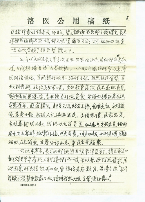 五十年代初期,长兄曾多次回忆此恶性事件,并向我反复叙述。父亲撰编“县[志]”内容梗概:一八五六年鸦片战争以来,帝国列强侵吞,军阀横行[倾]轧,混战不休。自然经济贫瘠,实业无能兴起,政治民生苦境。文化教育落后,民众愚昧负辱。荒沙高原更凄凉,青壮强力外流觅食,老弱妇孺饥寒交迫。灾荒连年,匪盗横生。耕者无田,纺者无棉,食难充饥,衣难蔽体,妻离子散,家破人亡,遍遍皆是。民情悲愤,民意思变,虽抗暴彼伏此起,然终以无成告罢。仁人志士,方兴未艾,拯救家乡,义不容辞,抵御外侮,匹夫有责。呼声四起,与日俱增,团结组织,众志[成][城]。立愚公移山志,争民主幸福来。