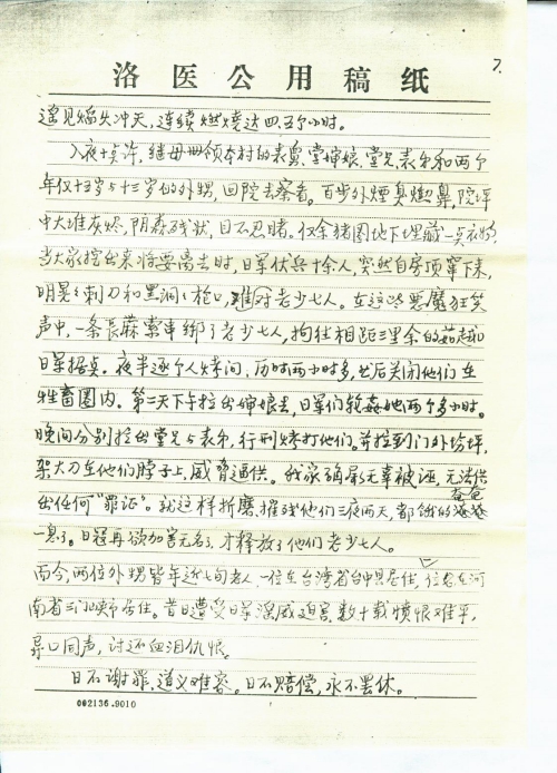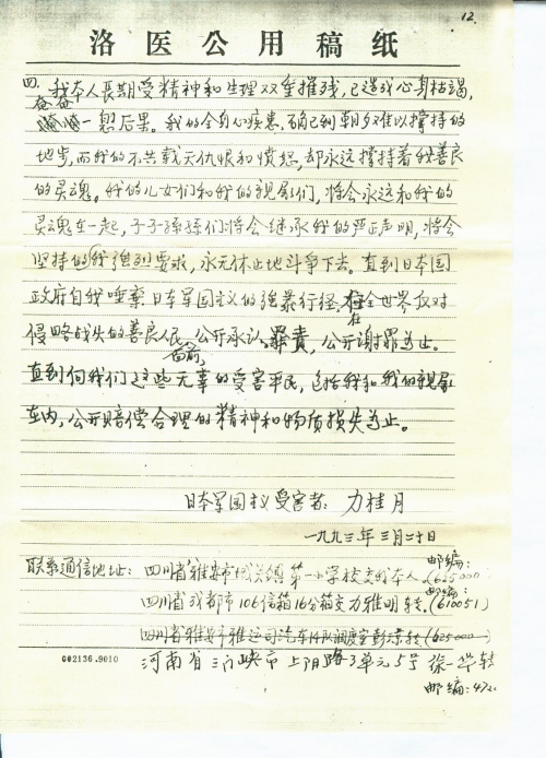 我已七十三岁高[龄],全身都是不治之症,犹如枯草,弱不[禁]风,但我要坚决控诉,咬紧牙关,拭目以待。我要挺身于向日本国讨公道行列,维护中华民族尊严,伸张国际正义。我和我的家庭,是无辜受害的中国平民,我们有理由有权利向日本军国主义索还血债。