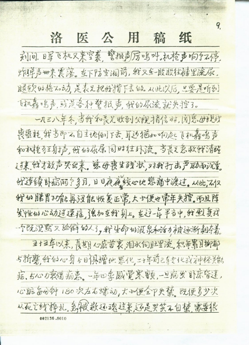 一九三八年冬,当我和长兄收到父亲捎信时,闻悉母亲残丧噩耗,我当即不自主地倒下去,耳边犹如响起飞机轰鸣声和机枪狂射声,我的尿屎同时往外流。当长兄急救我清醒过来,我才放声哭出来。慈母丧生残状,对我打击严励而沉重。我连续卧病两个多月,日日夜夜在绞心地悲痛中渡过。从此,不仅我的肠胃功能再没能恢复正常,大小便也常年失控。而且阵发性的心动过速症,强加在我身上。在这一年半当中,我[剧]变成一个既沉默又孤僻的人了,我生命的源泉和活力,被逐渐剥夺着。