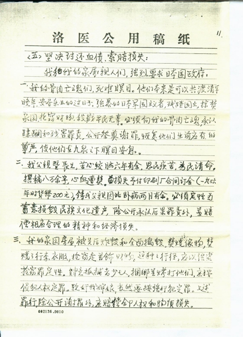 四、我本人长期受精神和生理双重摧残,已造成心身枯竭,奄奄一息后果。我的全身心疾患,确已到朝夕难以撑持的地步,而我的不共[戴]天仇恨和愤怒,却永远撑持着我善良的灵魂。我的儿女们和我的亲属们,将会永远和我的灵魂在一起,子子孙孙们将会继承我的严正声明,将会坚持我的强烈要求,永无休止地斗争下去。直到日本国政府自我唾弃,日本军国主义的强暴行径,在全世界仅对侵略战火的善良人民面前,公开承认罪责,公开谢罪为止。直到向我们这些无辜的受害平民,包括我和我的亲属在内,公开赔偿合理的精神和物质损失为止。