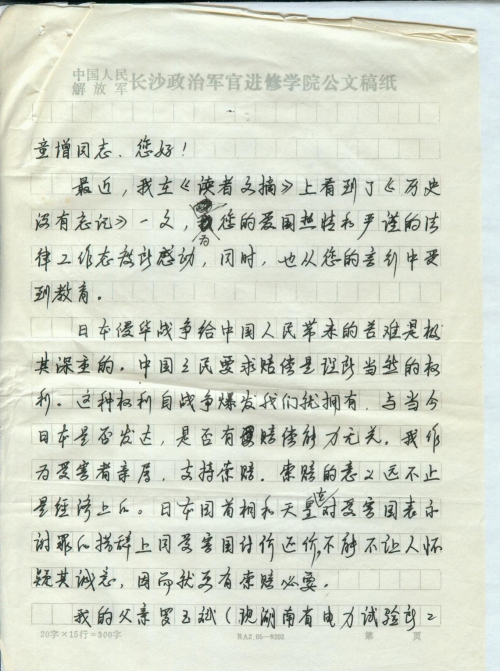 最近,我在《读者文摘》上看到了《历史没有忘记》一文,为您的爱国热情和严谨的法律工作态度所感动,同时,也从您的言行中受到教育。