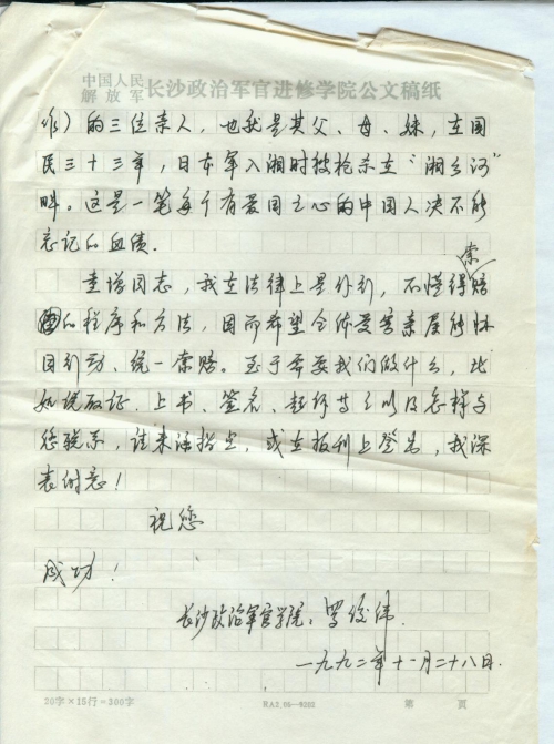 童增同志,我在法律上是外行,不懂得索赔的程序和方法,因而希望全体受害亲属能协同行动、统一索赔。至于需要我们做什么,比如说取证、上书、签名、起诉等等以及怎样与您联系,请来函指点,或在报刊上登出,我深表谢意!