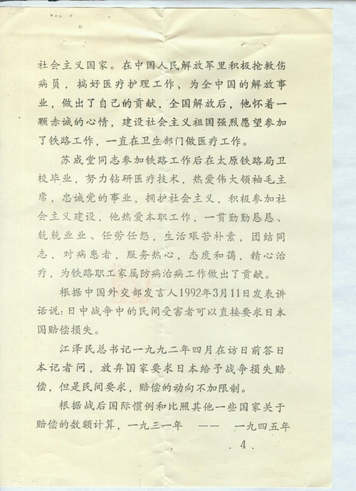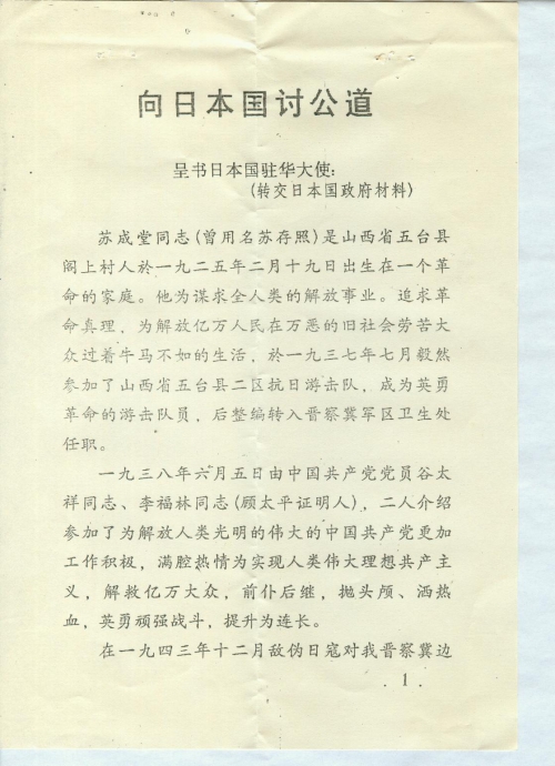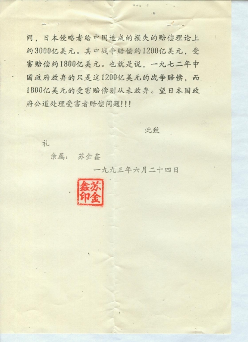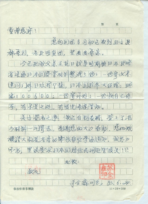 今已把我父亲在抗日战争时期被日本侵略者强逼日本国受害材料整理三份:一份寄北京建国门外日坛路7号,日本国驻华大使馆;邮编100600;一份寄你处;一份我自己保存,有不妥之处,有情况来函告知。