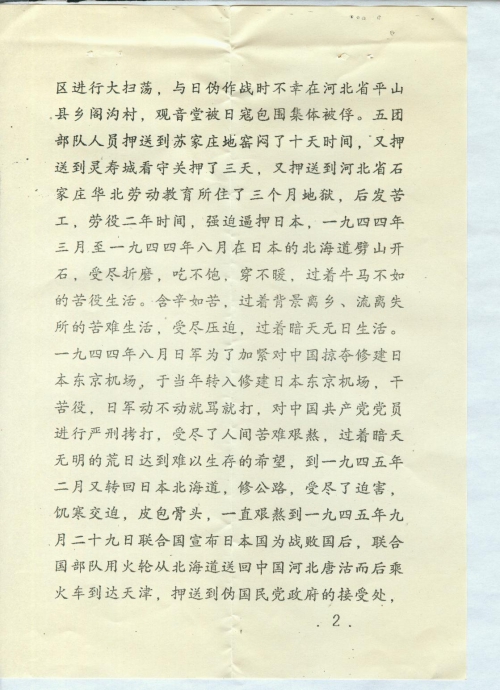 在一九四三年十二月敌伪日寇对我晋察冀边区进行大扫荡,与日伪作战时不幸在河北省平山县乡阁沟村,观音堂被日寇包围集体被俘。五团部队人员押送到苏家庄地窑闷了十天时间,又押送到灵寿城看守关押了三天,又押送到河北省石家庄华北劳动教育所住了三个月地狱,后发苦工,劳役二年时间,强迫逼押日本,一九四四年三月至一九四四年八月在日本的北海道劈山开石,受尽折磨,吃不饱,穿不暖,过着牛马不如的苦役生活。含辛[茹]苦,过着背景离乡、流离失所的苦难生活,受尽压迫,过着暗天无日生活。一九四四年八月日军为了加紧对中国掠夺修建日本东京机场,于当年转入修建日本东京机场,干苦役,日军动不动就骂就打,对中国共产党党员进行严刑拷打,受尽了人间苦难艰熬,过着暗天无明的荒日达到难以生存的希望,到一九四五二月又转回日本北海道,修公路,受尽了迫害,饥寒交迫,皮包骨头,一直艰熬到一九四五年九月二十九日联合国宣布日本国为战败国后,联合国部队用火轮从北海道送回中国河北[塘]沽而后乘火车到达天津,押送到伪国民党政府的接受处,即天津北洋大学,当时还有五团高华同志俩人一起商议逃跑,逃跑后寻找到党的组织晋察冀九分区政治部驻地联系上后,组织将他二人送到抗大二分校,后来一直在后勤部,当叶青山部长的勤务兵。当时地点在河北省任丘县北槽村。证明人:武英斌,此人现在在石家庄干休所休养。