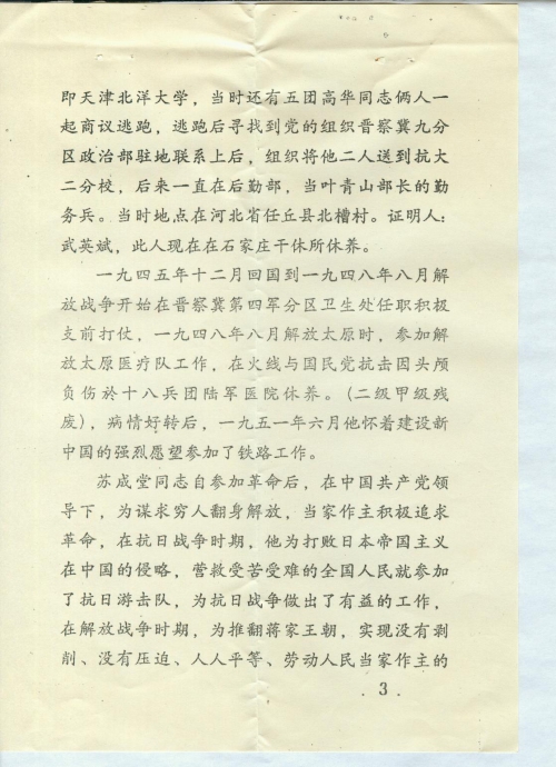 苏成堂同志自参加革命后,在中国共产党领导下,为谋求穷人翻身解放,当家作主积极追求革命,在抗日战争时期,他为打败日本帝国主义在中国的侵略,营救受苦受难的全国人民就参加了抗日游击队,为抗日战争做出了有益的工作,在解放战争时期,为推翻蒋家王朝,实现没有剥削、没有压迫、人人平等、劳动人民当家作主的社会主义国家。在中国人民解放军里积极抢救伤病员,搞好医疗护理工作,为全中国的解放事业,做出了自己的贡献,全国解放后,他怀着一颗赤诚的心情,建设社会主义祖国强烈愿望参加了铁路工作,一起在卫生部门做医疗工作。