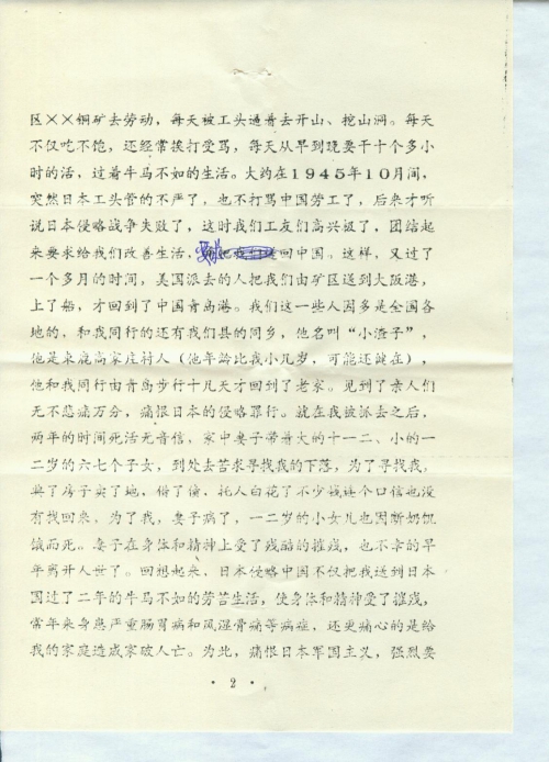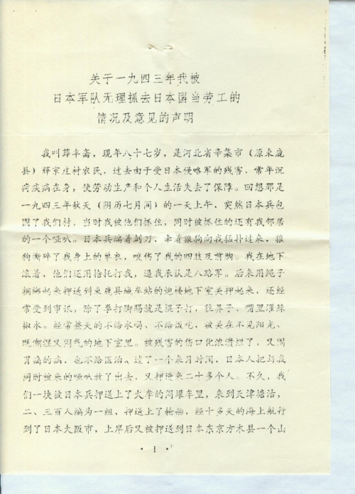 I am Xue Fengzhai, now 89, a farmer in the Xuejiazhuang Village, Xingji City (formerly Shulu County), Hebei Province. Because of the past persecutions by the Japanese Invasion Army, I have been seriously ill throughout the years and have lost the ability to work and maintain a personal livelihood. It was the morning of an autumn day in 1943 (July on the lunar calendar), Japanese soldiers surrounded our village suddenly. and I was captured by them right then. Being captured at the same time included a dumb person who was my neighbor. A Japanese soldier carrying a bayonet and leading a wolfhound rushed toward me; the wolfhound tore away my unlined garment, and bit and wounded my four limbs and my chest. While I rolled on the ground with pain, they clubbed me with the butt of their rifles and coerced me to admit that I was a member of the Eighth Route Army. Later they bounded me with ropes, escorted me to the turret at Shulu County Railway Station, and detained me in the basement. I was interrogated frequently. Besides punching and kicking, they also beat me with clubs, and poured pepper water into my nose and mouth. Often I was given no water and no food for a whole day. I was imprisoned in a humid and stuffy basement without sunlight. The wounds on my body festered. I also developed stomachaches but received no medical treatment. After about one month, the Japanese released the dumb person who was captured together with me, and detained another 20 or so people. Soon afterwards, we were all forced onto a box car by the Japanese soldiers and dispatched to Tanggu in Tianjin. We were then escorted onto a ship in groups of 200 to 300 people. After about a dozen days of voyage on the sea, we arrived at Osaka in Japan. After landing, we were escorted to a mountain copper mine in Tochigi Prefecture near Tokyo, Japan, to work as slave laborers. Each day we were forced by the foremen to work on the mountain and dig caves. Besides inadequate food each day, we were often beaten and abused. Each day from morning till evening we had to work for more than 10 hours and lived a life inferior to that of beasts. Around October, 1945, all of a sudden the Japanese foremen relaxed their control and stopped beating or cursing Chinese laborers. Later, we learned that Japan had lost the war. At that moment, my fellow laborers were overjoyed. We were united in demanding improvements of our living conditions. Above all, we wanted to return to China. In this way and after more than a month, American officers sent us from the mine to Osaka Port where we boarded a ship and returned to Qingdao Port, China. Since we had come from all regions across the nation, only one person who had come from the same county as mine traveled home with me. His name was “Xiaozhazi”, a native of Gaojiazhuang Village, Shulu (he was several years younger than me and may still be alive). We traveled together and walked for over a dozen days from Qingdao before arriving at our hometown. Reunited with our endeared ones, everyone felt sad beyond description. We bitterly hated the Japanese invasion crimes. For two years after my capture, my family and I had no contact or information about each other. My wife took six to seven children ranging from 12-year old to one-year old to look for me. In order to find me, she pawned the house, sold the land, borrowed loans, and spent a small fortune trying to find my whereabouts, all for naught. For this reason, my wife became ill; my one-year old youngest daughter was starved to death due to lack of milk. My wife suffered cruel persecution both mentally and physically, and, alas, passed away early. In retrospection, Japanese invasion into China not only sent me to Japan for two years of hard life that was worse than the lives of beasts, caused me to suffer both mental traumas and physical injuries, induced serious gastrointestinal disease and rheumatism symptoms in me; what’s more heart-breaking is that they destroyed and brought deaths to my family. For this reason, I bitterly hate the Japanese Militarism. I strongly demand the current Japanese government to profoundly repent crimes committed by the Japanese Militarism in the past, to offer apologies to the vast number of innocent Chinese people who had suffered from persecution, and to provide economic reparations to the victims.