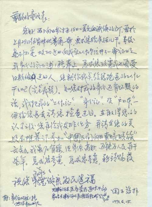 为了向日本讨还1800美元血泪债的问题,曾于上月28日很冒昧地寄信一封,要求您给点活儿干。事后感到不妥,故而近日向我原工作单位开了一封证明。我身份的证明书一张奉上。恳求您考虑我也曾受日欺侮过过的人。您就给我点给您跑道的工作干干吧(完全义务)。如您对我的身份还有怀疑的话我可把我的“工作证”、“身份证”及“户口簿”给您送去,请您检查过目。在取得您的认可之后您再给我安排任务。并请在您的关照和推荐之下参加“中国民间向日索赔联合会”出点力。我虽70有余,但身体尚好,还能为人民再干些年。恳求您考虑,恳求您考虑,务请赐教。谢谢。