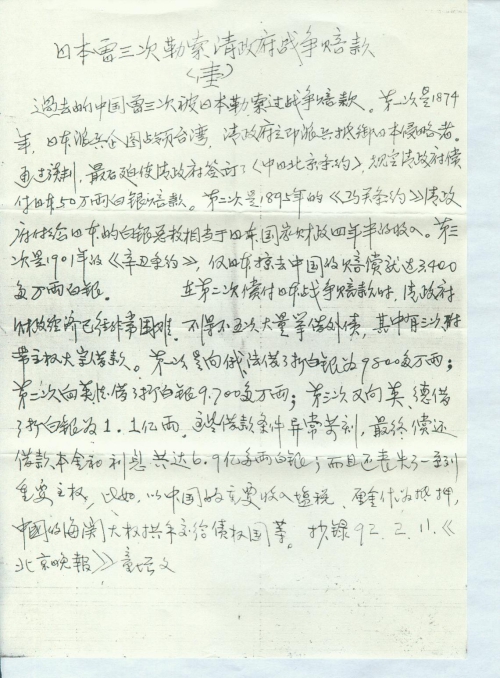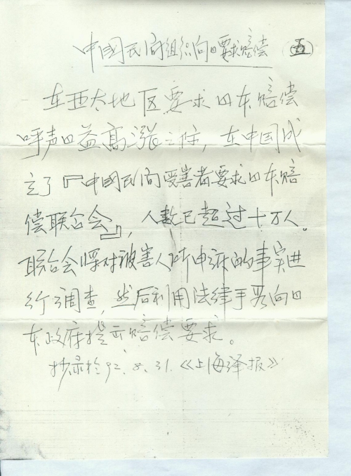 细节:寄来报纸上关于对日索赔的报道。