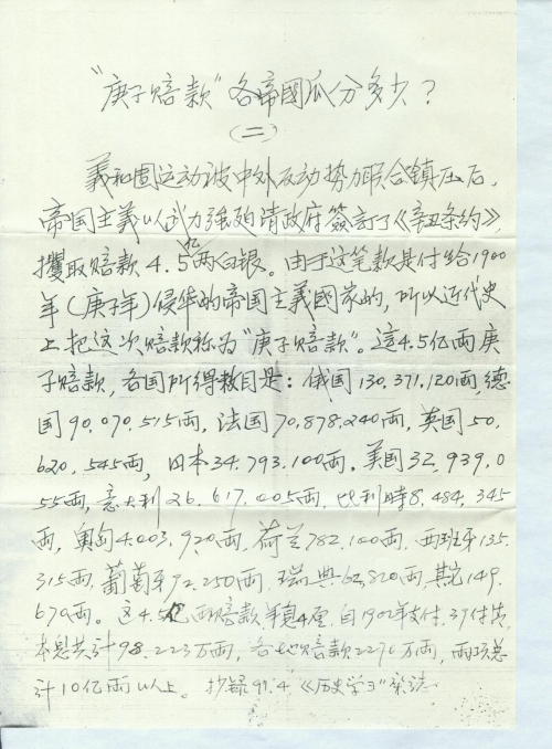 义和团运动被中外反动势力联合镇压后,帝国主义以武力强迫清政府签订了《辛丑条约》,攫取赔款4.5亿两白银。由于这笔款是付给1900年(庚子年)侵华的帝国主义国家的,所以近代史上把这次赔款称为“庚子赔款”。这4.5亿两庚子赔款,各国所得数目是:俄国130,371,120两,德国90,070,515两,法国70,878,240两,英国50,620,545两,日本34,793,100两,美国32,939,055两,意大利26,617,405两,比利时8,484,345两,奥匈4,003,920两,荷兰782,100两,西班牙135,315两,葡萄牙92,250两,瑞典62,820两,其它149,670两。这4.5亿两赔款,年息4厘,自1902年支付,39付清,本息共计98,223万两,各地赔款2270万两,两项总计10亿两以上。抄录91.4《历史学习》杂志