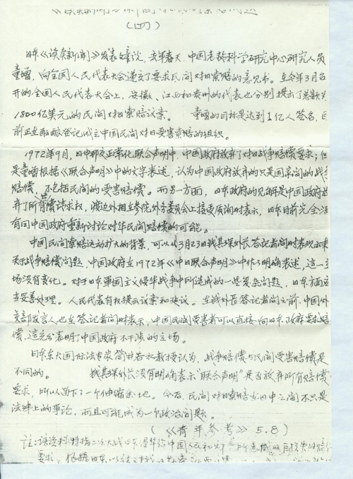日本东大国际法专家筒井若水教授认为,战争赔偿与民间受害赔偿是不同的。钱其琛外长没有明确表示“联合声明”是否放弃所有赔偿要求,所以留下了一个伸缩余地。今后,民间对日索赔在日中之间不只是法律上的争论,而且可能成为一个政治问题。(《青年参考》5.8)