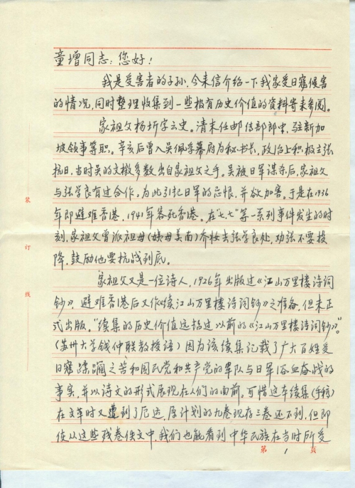 我是受害者的子孙,近来信介绍一下我家受日寇侵害的情况,同时整理收集到一些极有历史价值的资料寄来参阅。