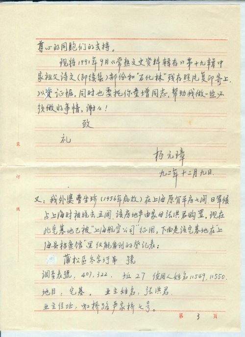 现将1991年9月《常熟文史资料辑存》第十九辑中家祖父诗文(即续集)部分和“石化林”残存照片复印寄上,以资证据。同时也委托你童增同志,帮助我做一些必须做的事情。谢谢!