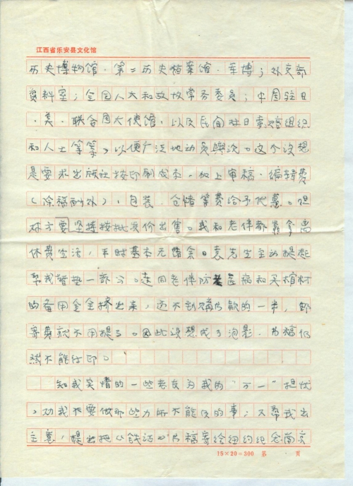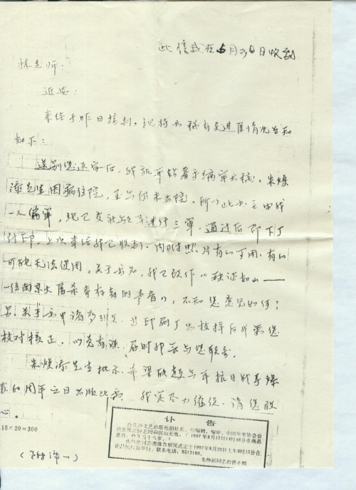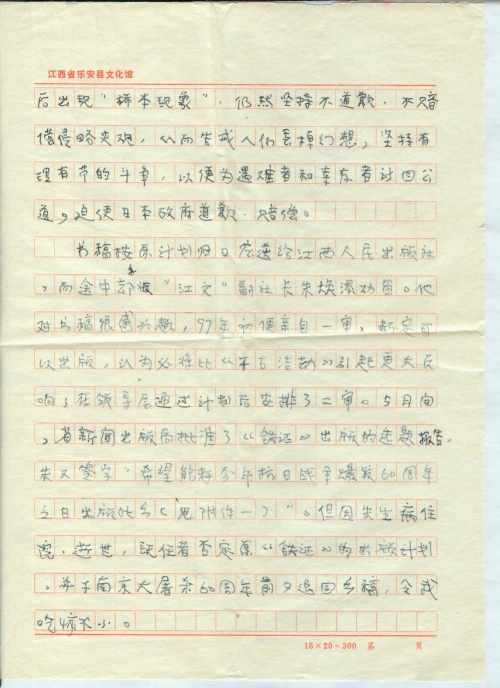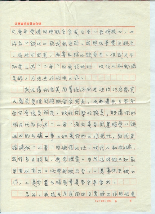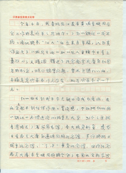 前几年一直埋头研究南京大屠杀的历史资料,未曾和你通信;后来由于双目近乎失明,又未能写信给你,请体谅。