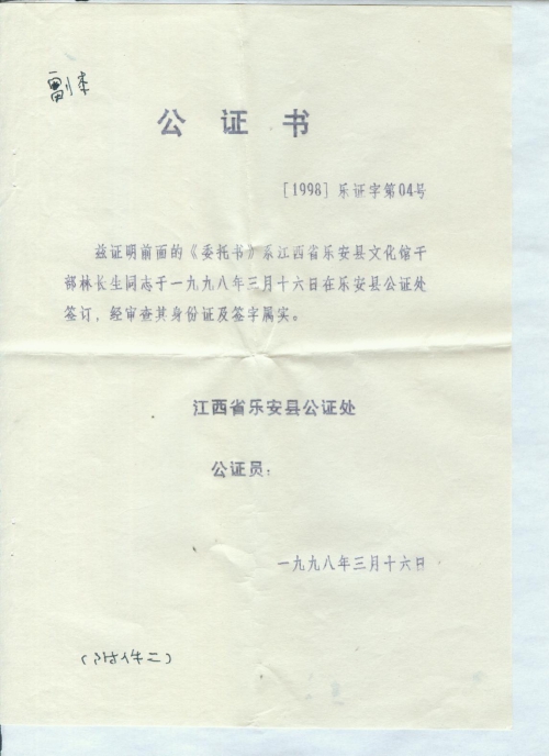 兹证明前面的《委托书》系江西省乐安县文化馆干部林长生同志于一九九八年三月十六日在乐安县公证处签订,经审查其身份证及签字属实。