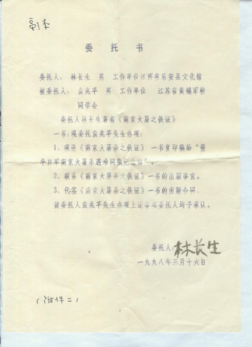 委托人林长生著有《南京大屠杀之铁证》一书:现委托袁兆平先生办理: