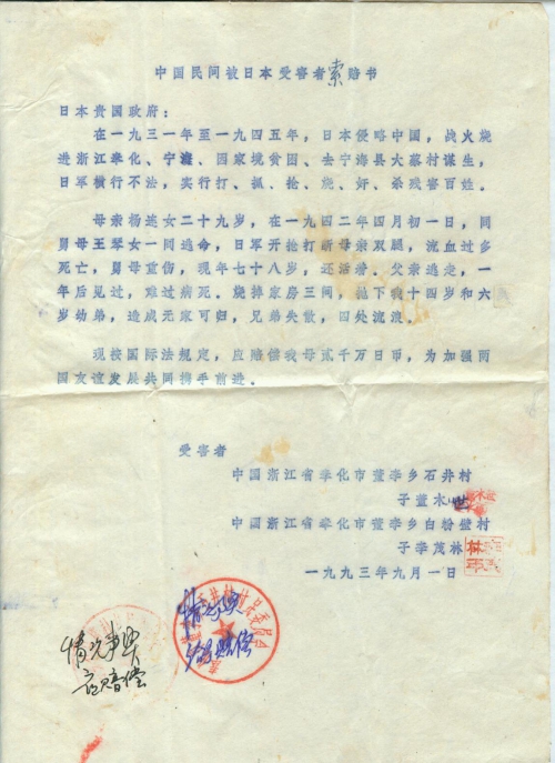 Chinese Victim’s Letter of Claim for Damage Compensation from Japan