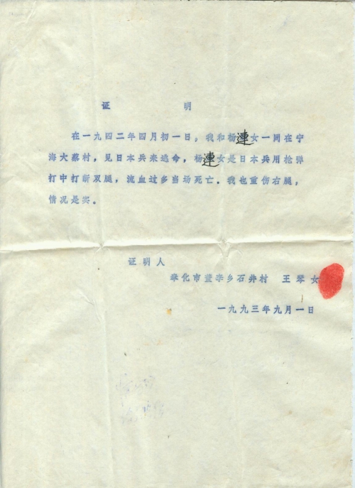 Other details:In 1942 my mother Yang Liannv and aunt Wang Qinnv together fled, and died after two legs were broken by the Japanese Army due to excessive bleeding. My aunt was seriously injured, but survived. I demand Japan to give compensation. The letter included seal of the village committee as proof. Note: The envelope is missing