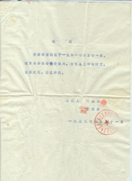 On April 1, 1942, when Yang Liannv and I saw a Japanese soldier in Dacai Village, Ninghai County, we began to run. But Yang Liannv was shot in the legs, bled heavily and died on the spot. I was seriously injured in the right leg.