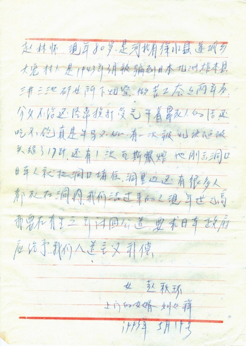 赵林怀,现年80岁,是河北省徐水县遂城乡大宠村人,是1943年3月被骗到日本九州[熊]本县三井三池矿业所下煤窑,做苦工整整两年多,分文不给还经常挨打受气,干着累死人的活,还吃不饱,真是牛马不如,有一次被煤块砸破头缝了17针,还有1次瓦斯爆炸,他刚出洞口日本人就把洞口堵住,洞里边还有很多人都死在洞内,我们活过来的人现年世已高,我要在有生之年讨回公道,要求日本政府应给予我们人道主义补偿。