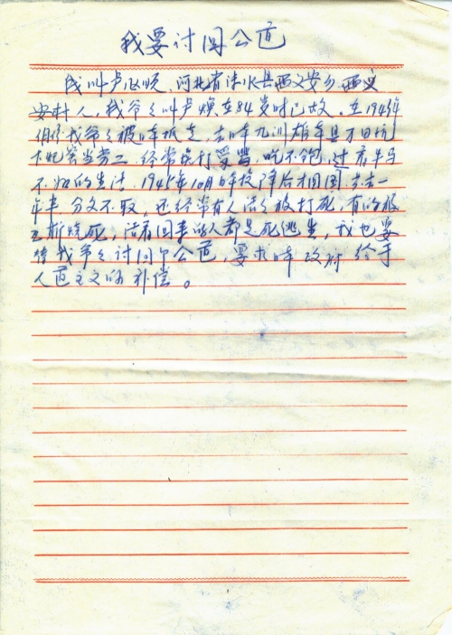 我叫卢风顺,河北省涞水县西义安乡西义安村人,我爷爷叫卢焕,在84时已故,在1943年3月份,我爷爷被日本抓走,去日本九州[熊]本县万田坑下煤窑当劳工,经常挨打受骂,吃不饱,过着牛马不如的生活,1945年10月日本投降后,才回国,前去一年半,分文不取,还经常有人活活被打死,有的被瓦斯烧死,活着回来的人都是死逃生,我也要替我爷爷讨回个公道,要求日本政府给[予]人道主义的补偿。