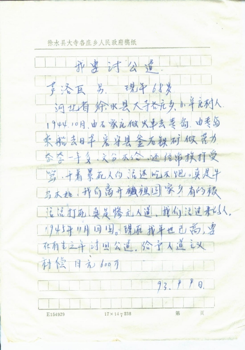 细节:芦洛臣1944年10月被从石家庄做火车运到青岛,再乘船去日本,做劳工一年多,吃不饱,过着牛马不如的生活,期间有人被打死,在1945年被送回国,要求日本赔偿。备注:信封丢失