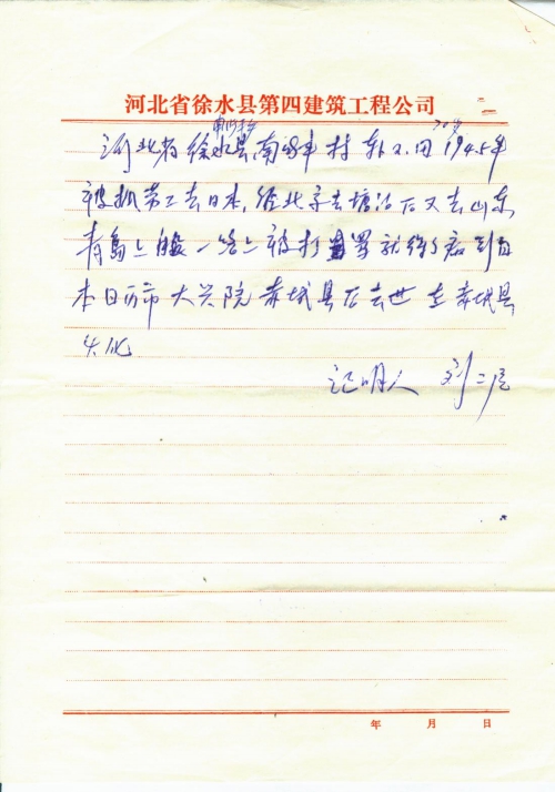 21 10 月, 2018 s3033 Share EmailTwitterFacebookGoogle +PinterestTumblrLinkedinVkontakte 信扫描序列号:s3033 写信日期:信中没写 写信地址:河北省保定市徐水县 受害日期:1945 受害地址:河北省保定市徐水县 写信人:刘二层 受害人:韩玉田 类别:劳工(SL) 细节:韩玉田在1945年被日军抓到日本做劳工,一路被打骂,到了日本后就去世了。备注:信封丢失 河北省徐水县南张平乡南张丰村韩玉田,70岁,1945年被抓劳工去日本,经北京区塘沽后又去山东青岛上船一路上被打骂就得了病到日本日历市大兴院赤城县后去世在赤城县火化。 证明人 刘二层 21 10 月, 2018 10000cfj_3o5som 劳工(SL)