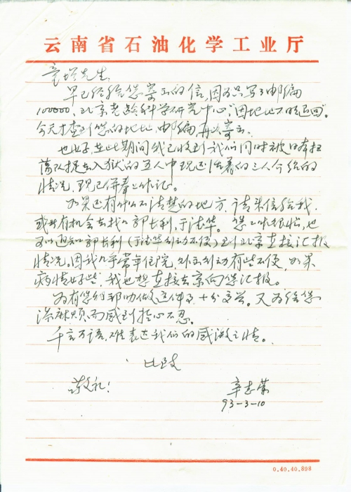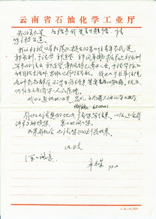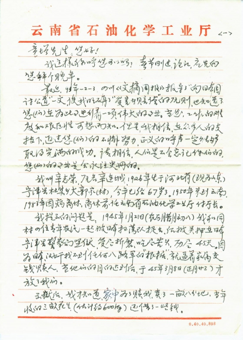 我叫辛志荣,原名辛连城,1926年生于河北省(现为山东),宁津县杜集乡大郭家(村),今年已经67岁了。1950年来到云南,1983年因病离休,离休前任云南省石油化学工业厅[副]厅长。