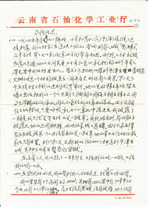 我1940年2月就参加了革命工作,在宁津县抗日参议会,一地委交通科。1945年1月21日我被日本扫荡队捉时,我就在地委交通科工作。因为我穿农民服装,又住本地(当地人)所以我始终没有暴露身份,才随同本村几个被抓的人用钱赎出,(而且出狱后,我才知道,地委也同意由家中名义办),我1949年由南京随西南服务回来云南至今,由于与老家联系较少,一同被捉人的名字也记不清了,不过我已写信去问,估计很快就会得到答复,然后,再奉告。