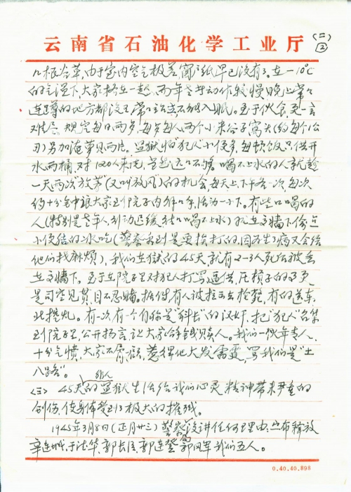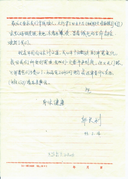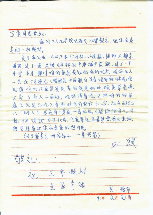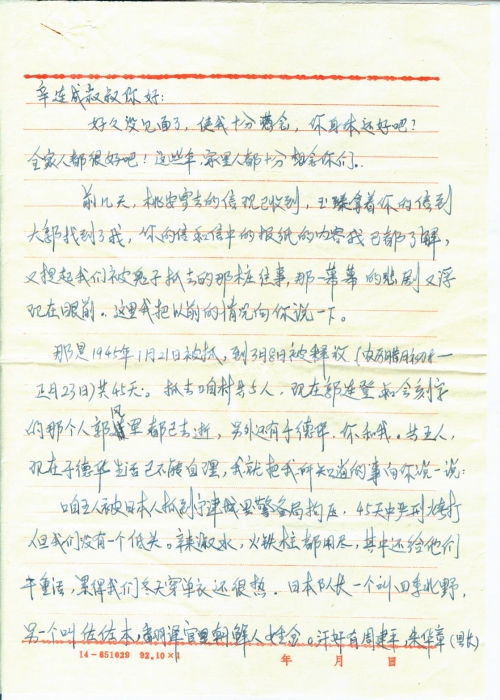 关于我们在一九四五年十二月初八被捕,捕到大柳李胡家,过了一夜,又被日本转到宁津城里监狱,过了一个月零半月,那时咱们家庭花钱把我们买出,咱们五人一共花十万多元(指的是中国联合准备银行的日本币)你知道咱们几家是贫农,花的钱是把油、粮食等卖掉,又卖了每人二亩地,吃粮借着吃,这样咱们的家庭生活是无吃无穿,那时我们仅仅十八岁,现在已经七十八十的人了,我还有一身病——高血压,不能随便出入,听说日本赔款,特写此信,但重要还是希望你有空来玩,没空请寄张你和全家的照片来。