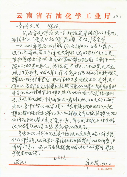 最近,93年-2-3,四川《文摘周报》报导了“向日本国讨公道”一文,使我明确了“受害者赔偿”的原则,也知道了您(们)在为此事进行着一项伟大的事业。当然,工作的难度和艰巨性可想而知,但是,我相信,在众多人的支持下,通过您(们)的不懈努力,正义的呼声一定能够取得完满的成功,请相信,人们是不会忘记你们的,您(们)的事业是会永[驻]史册的。
