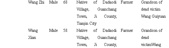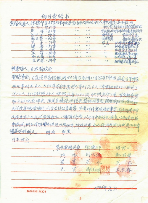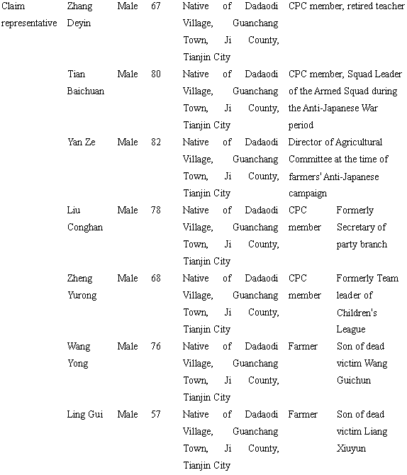Reason for claim: On May 21 (July 4 on the Gregorian calendar), 1942, on the lunar calendar when the Japanese invaders were at its most wanton period, the Japanese Army barbarically killed 6 innocent villagers. They also killed 6 innocent villagers (excluding 13 persons who joined the army and died in action) before and after a mopping-up campaign. They killed a total of 12 persons, wounded and caused disability to 25 persons, burned 3150 civilian houses, and destroyed 7 temples. Others things, such as grains and properties, were all burned or looted. The resulting direct economic losses are estimated to be around USD 1.5 billion. According to international practices and principles of civilian damage reparations, the Japanese authority must give it a serious thought. It must solemnly treat objective historical facts and quickly offer apologies to all Chinese people and reparations to the vast number of civilian victims so as to demonstrate its sincerity for Sino-Japanese friendship. In this way, it can remove hostilities caused by the war, enhance mutual understanding, and promote global peace, scientific and technological progress, cultural & economic exchange and development, and usher in a happy and beautiful tomorrow.