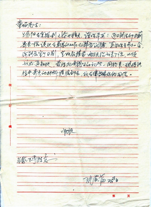 It has been more than twenty days since we said goodbye to each other in Beijing on February 19. I suppose you are well! Recently, Sun Fayin mailed a letter to me from Ji County saying that he had completed the preparation in Ji County and was waiting for you to attend the meeting. Could you please fix a date and send me a letter two to three days in advance so that I can notify him? It would be good to invite reporters from TV stations as well. I have enclosed the material sent by Zhang Xinzhong in this letter and will wait for your reply in Tianjin.