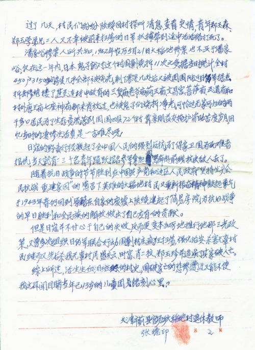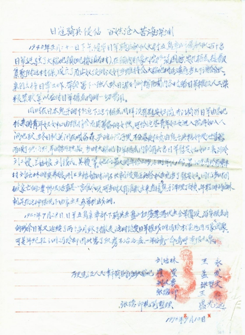 Other details:In 1940 the Japanese Army invaded my hometown, and forced Feng Ling, Anut Liu, and a girl surnamed Lan to work as comfort women. Zheng Yuxue brothers were killed by the Japanese Army when returning home to learn news. In 1942 the Japanese Army organized up to 11 times of siege in Panjiayu, and the whole village was all burned. They killed villagers, dismantled houses, and looted grain.