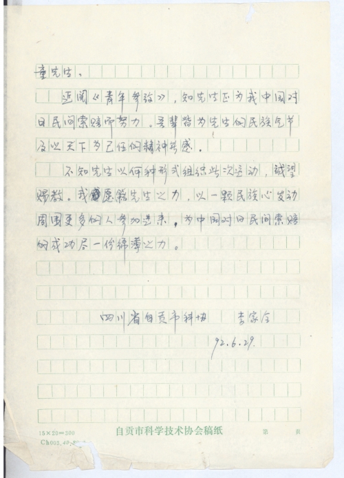 21 10 月, 2018 s3065 Share EmailTwitterFacebookGoogle +PinterestTumblrLinkedinVkontakte 信扫描序列号:s3065 写信日期:1992-06-29 写信地址:四川省自贡市 受害日期:无 受害地址:无 写信人:李家全 受害人:无 类别:其它(OT) 细节:我愿为童先生出力,支持索赔事业。 童先生: 近阅《青年参考》,知先生正为我中国对日民间索赔而努力。吾辈皆为先生的民族气节及以天下为己任的精神所感。 不知先生以何种形式组织此次运动,诚望赐教。我愿[借]先生之力,以一颗民族心发动周围更多的人参加进来,为中国对日民间索赔的成功尽一份绵薄之力。 四川省自贡市科协:李家全 92.6.29 21 10 月, 2018 10000cfj_3o5som 其它(OT)