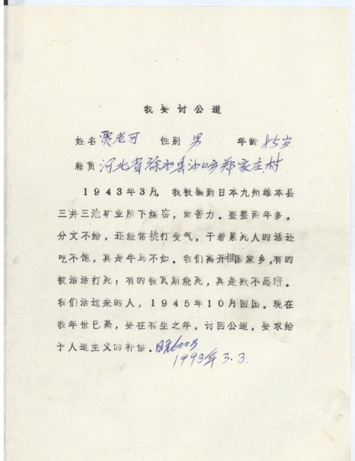 1943年3月,我被骗到日本九州[熊]本县三井三池矿业所下煤窑,做苦力,整整两年多,分文不给,还经常挨打受气,干着累死人的活还吃不饱,真是牛马不如。我们离开祖国家乡,有的被活活打死,有的被瓦斯烧死,真是[惨]不忍睹,我们活过来的人,1945年10月回国。现在我年[事]已高,要在有生之年,讨回公道,要求给予人道主义的补偿。日元600万。