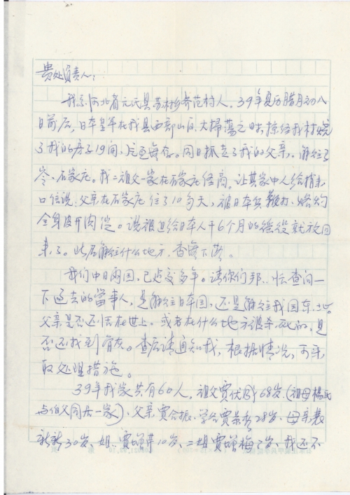 五十多年前,日本鬼子在我国惨无人道,无恶不为,使千万个家庭妻离子散,家破人亡,几千万安善良民,留下及其深刻的冤仇,五十多年来,从未听说过有人还问此案,据老乡李二楼同志的介绍说:你为第二次世界大战我国的受害者鸣冤泄愤的发起人,谢谢你,为人民服务的高尚品德,谢谢,不过此案矛盾重。……看来你得尽较大的努力,耗费较多的心血才能圆满成功,谢谢。