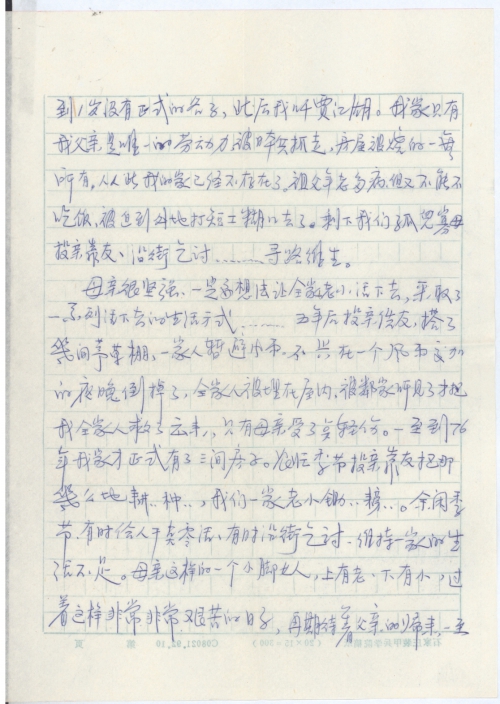 母亲很坚强,一是要想法让全家老小活下去,采取了一系列活下去的生活方式……五年后投亲靠友,搭了几间茅草棚,一家人暂避风雨,不[幸]在一个风雨交加的夜晚倒掉了,全家人被埋在屋内,被邻家听见了才把我全家人救了出来,只有母亲受了点轻伤。一[直]到76年我家才正式有了三间房子。农忙季节投亲靠友把那几么地耕耕种种,我们一家老小锄锄耪耪。[闲余]季节,有时给人干点零活,有时沿街乞讨,维持一家人的生活不足。母亲这样一个小脚女人,上有老下有小,过着非常非常艰苦的日子,再期待着父亲的归来,一[直]没有消息。在这样的艰苦岁月里,母亲[积]劳成疾,早年丧于心脏病的折磨之下。